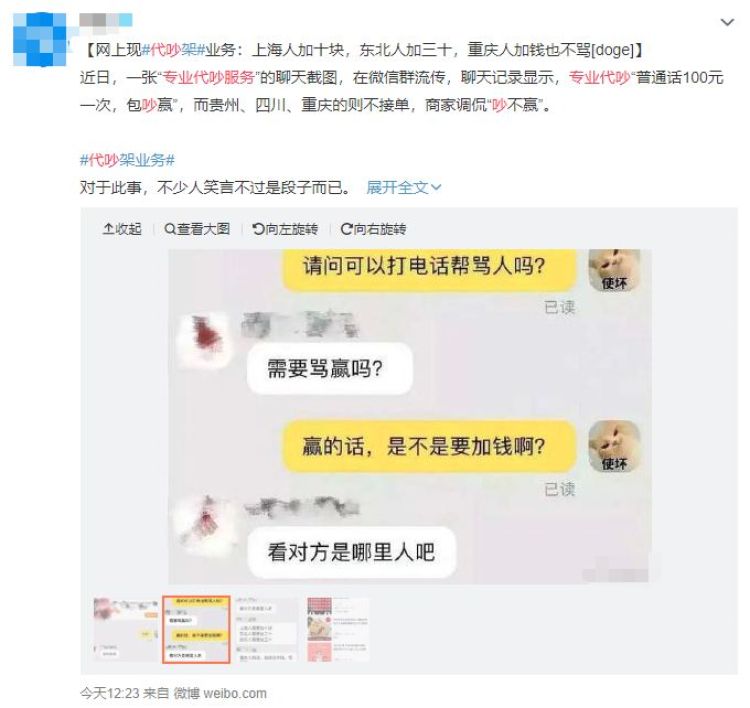 近日,一则专业代吵服务的聊天截图在网上流传,聊天记录称专业代吵,“普通话100元一次,包吵赢”,对于上海、广东、湖北、福建等地的方言则需要加钱,而贵州、四川、重庆则不接单,商家调侃“吵不赢”。
