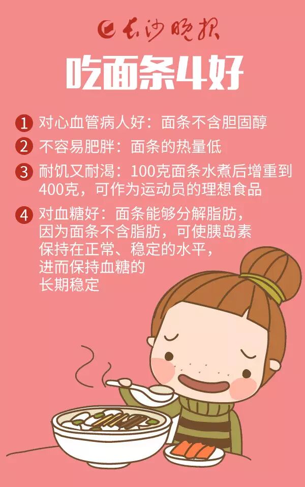 第三,面条能够分解脂肪,因为面条不含脂肪,可使胰岛素保持在正常、稳定的水平。